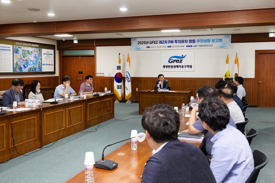 광양만권경제자유구역청(청장 구충곤, 이하 광양경자청)은 25일 청사 상황실에서 투자유치 담당 PM(Project Manager) 등 임직원 20여 명이 참석한 가운데, ‘2025년 제2차 PM 투자유치 활동 추진 상황 보고회’를 개최했다고 밝혔다.